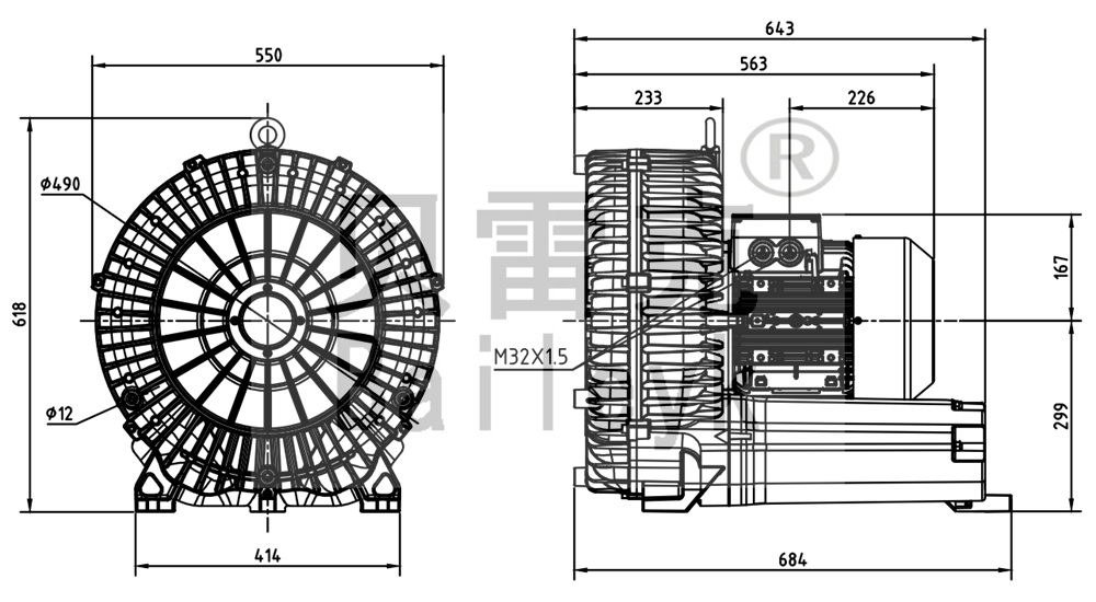最大風量:1370m3/h 最大正壓:110mbar 最大負壓:120mbar 防護等級:IP55 噪音:75db 重量:98Kg
