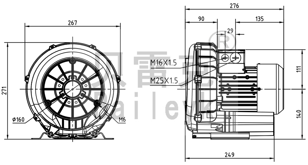 最大風(fēng)量:140m3/h 最大正壓:60mbar 最大負壓:60mbar 防護等級:IP55 噪音:56db 重量:12Kg