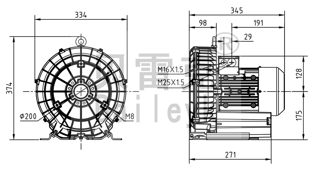 最大風(fēng)量:210m3/h 最大正壓:190mbar 最大負(fù)壓:200mbar 防護(hù)等級(jí):IP55 噪音:64db 重量:23Kg